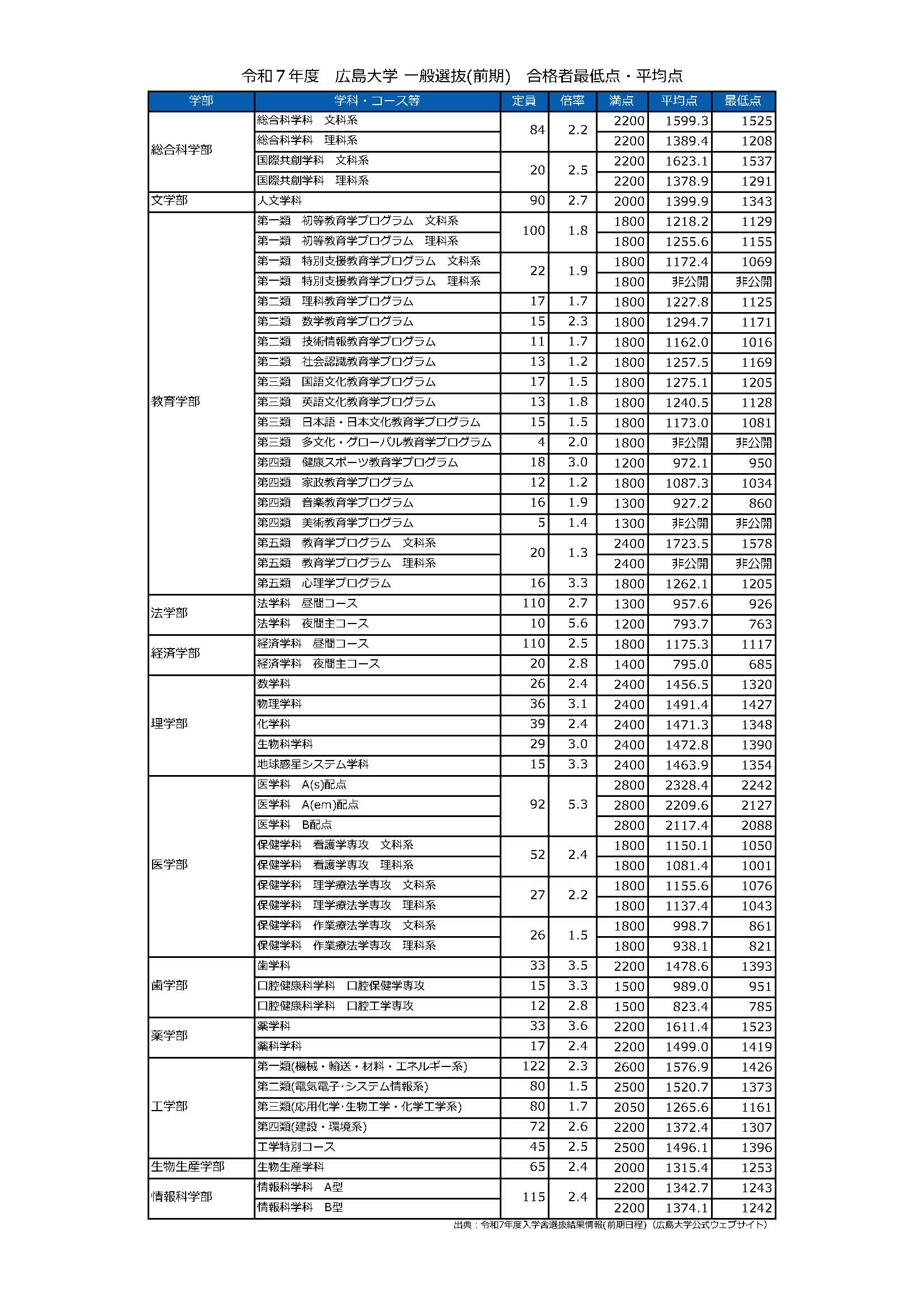 広島大学の各学部・学科には毎年「合格者最低点」「合格者平均点」が公表されています。