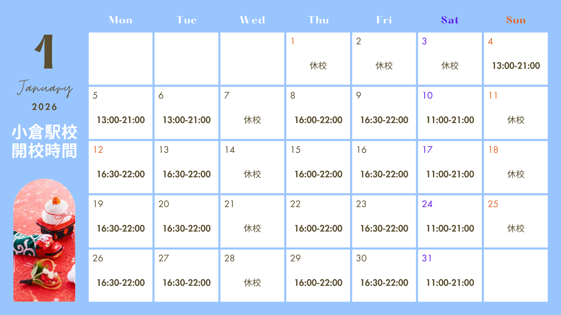 小倉駅校の1月の開校日程をお知らせします。